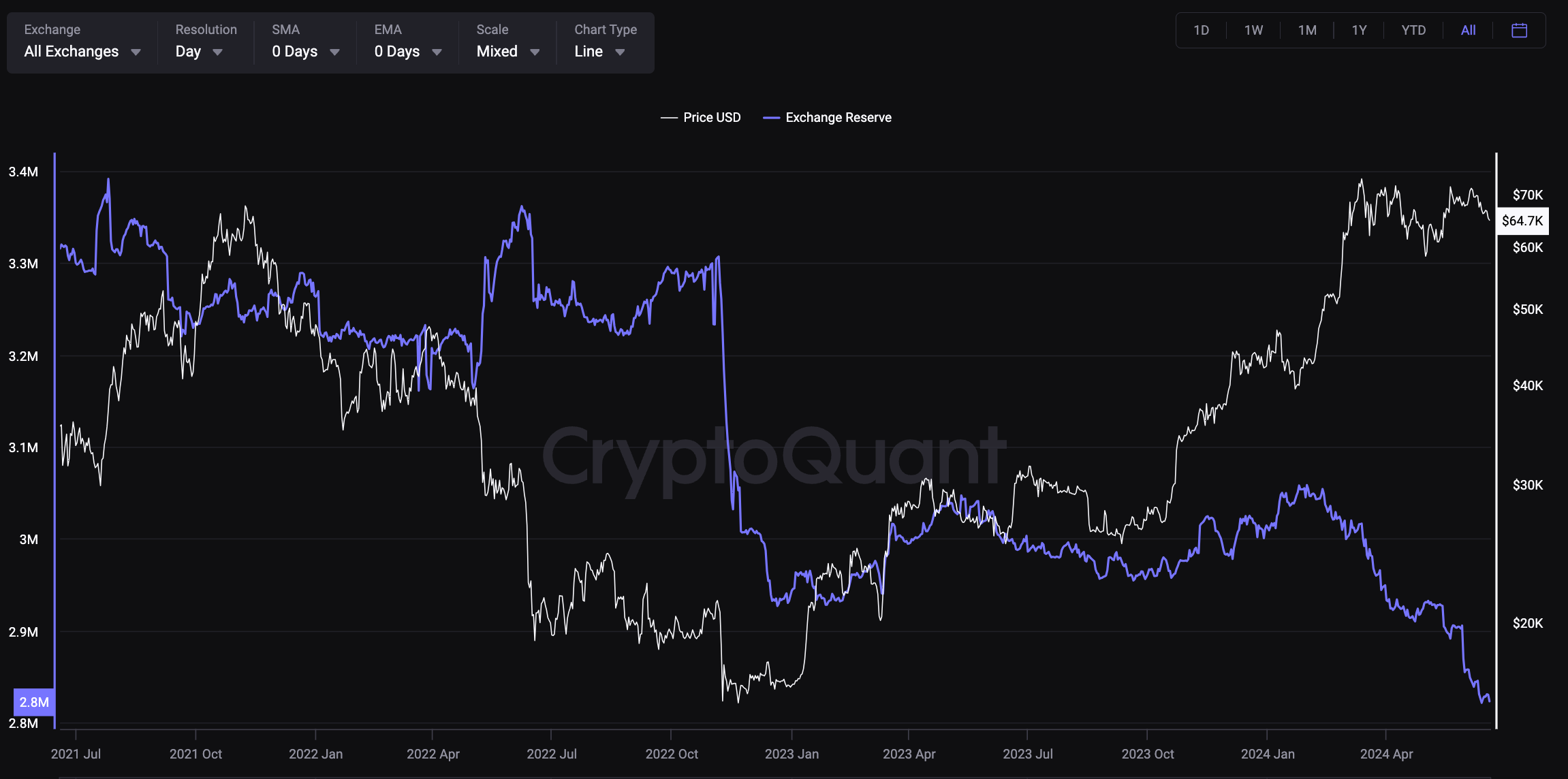 低交易所储备(有时被称为交易所余额)显示出低抛售压力和潜在的供应冲击。