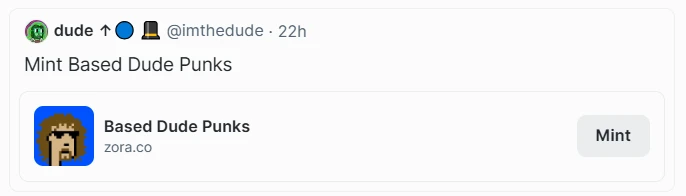Frame 是 Warpcast 的交互模块。用户在客户端内就可以实现各种链上交互功能,投票、mint NFT、小游戏、领空投都可以通过 Frame 模块实现。