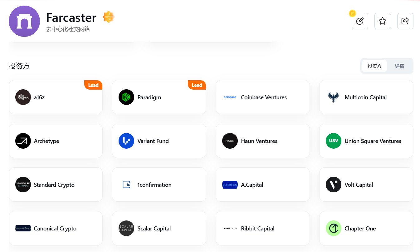Farcaster 的融资背景也很硬实力, 5 月 Farcaster 宣布以 10 亿美元估值完成 1.5 亿美元 A 轮融资,Paradigm 领投,a16z crypto、Haun Ventures、Union Square Ventures、Variant Fund、Standard Crypto 等机构参投。