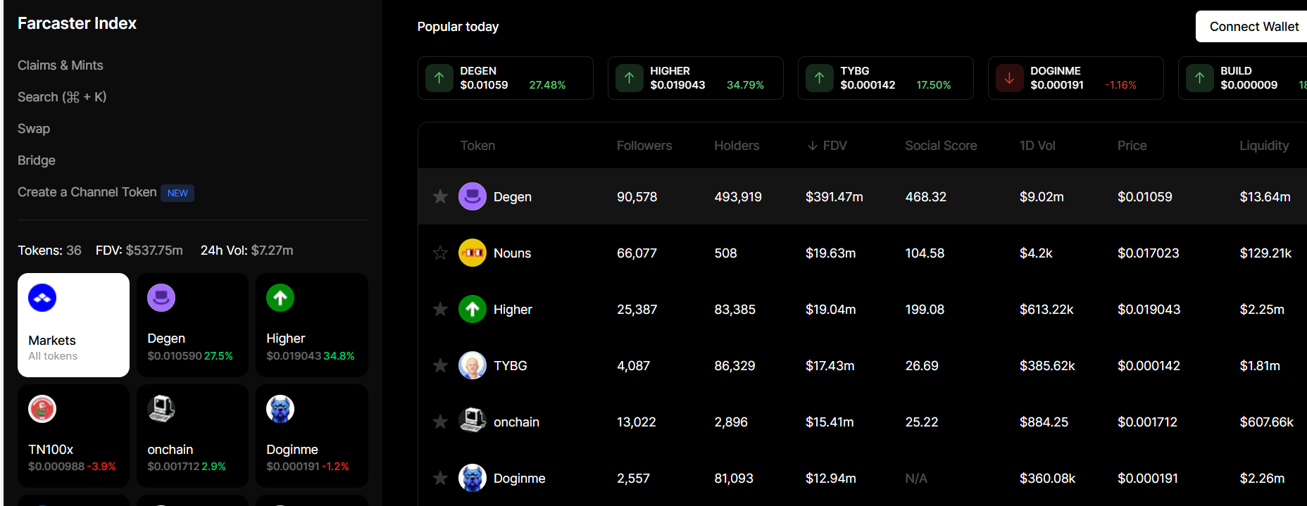 可以使用关联的 Base 钱包和 Warpcast 绑定钱包体验 Farcaster Index ,交易 Farcaster 生态的 Meme 币,比如大火的 $Degen、$Nouns。