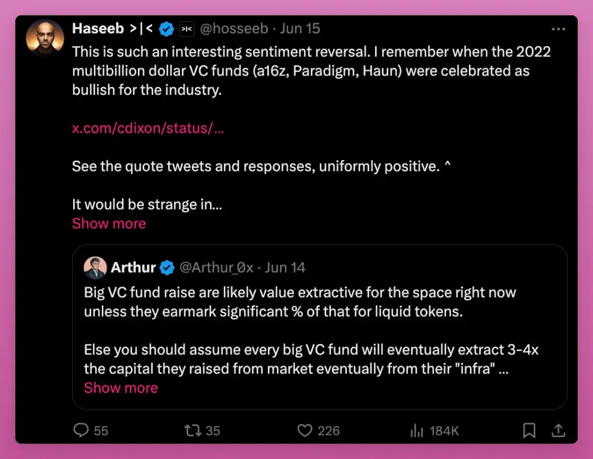 VC 正在承担他们应有的责任。曾经被视为积极信号的大型 VC 投资,现在被加密社区视为抽取价值。担忧在于 VC 旨在通过出售其大额分配来获利,这些分配他们以最低成本获得。