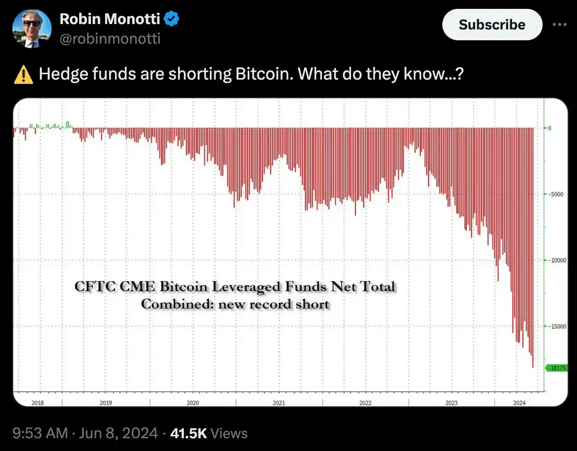 原来,对冲基金正在创纪录地通过 CME 期货做空比特币。