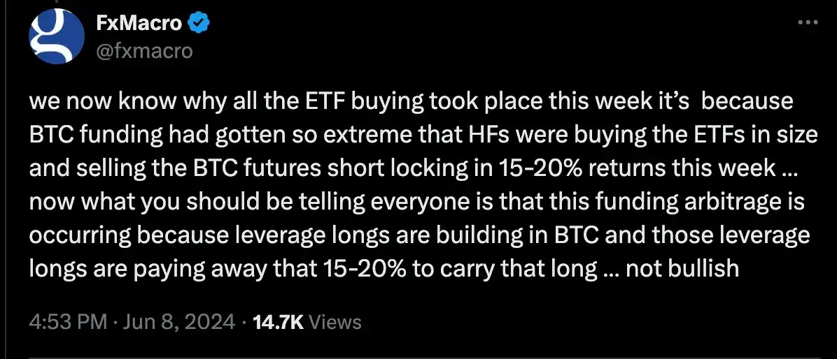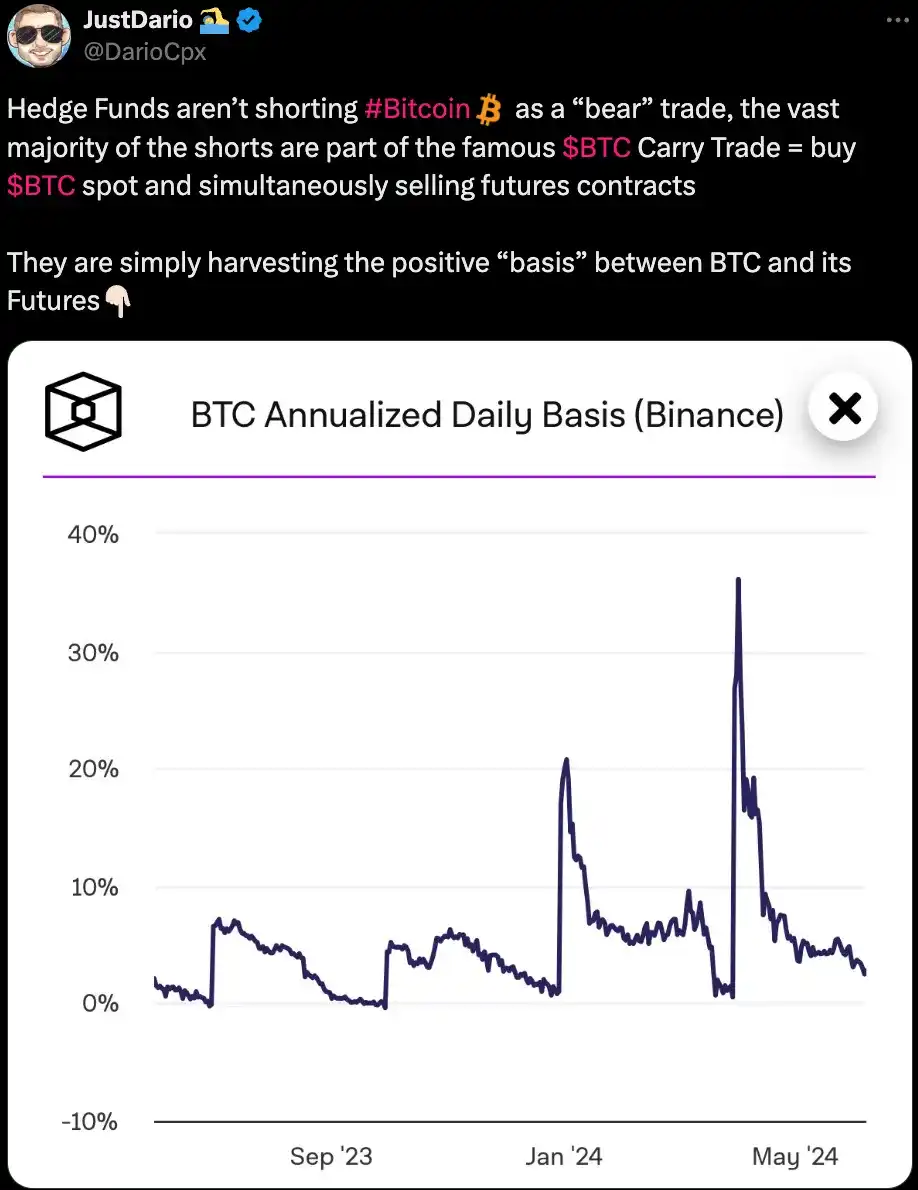 可能的解释是对冲基金买入现货并做空 BTC,进行 15%-20% 的中性策略。