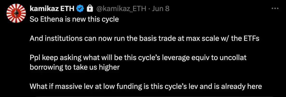 策略与 Ethena 相同。「如果低资金率的大量杠杆是这个周期的杠杆并且已经存在了怎么办」- Kamizak ETH