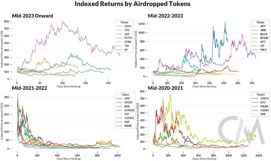 空投分发代币以促进协议采用,通常会被接收者迅速变现。虽然最初利润丰厚,但大多数空投代币都会长期贬值,但 BONK 等例外(回报率约为 8 倍)。