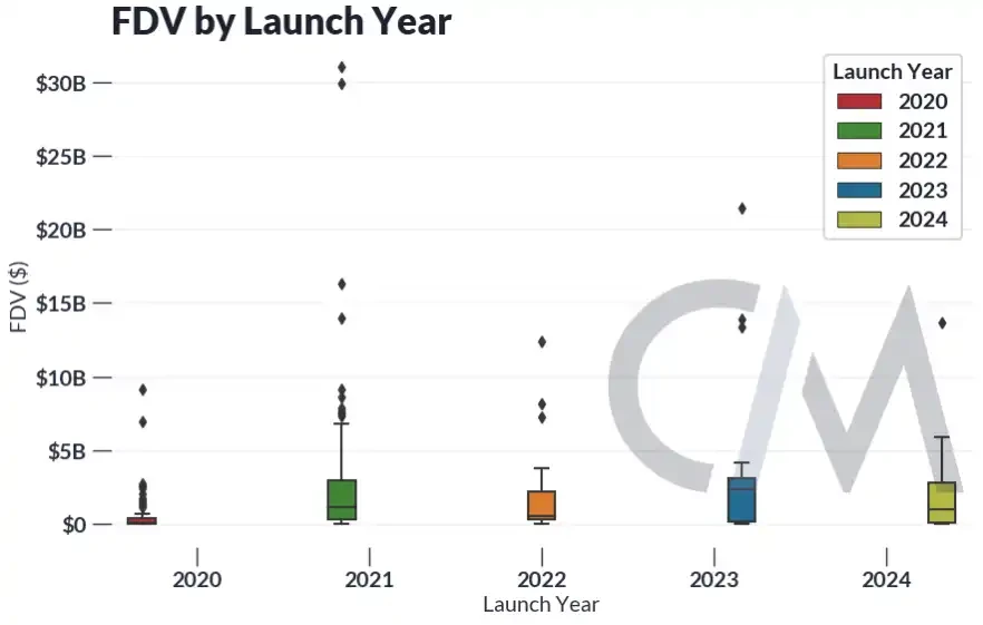 FDV 的发布可以暗示市场如何衡量当前项目发布后的未来价值。下面是 FDV 的图表,涵盖多个加密代币,按项目发布年份划分。