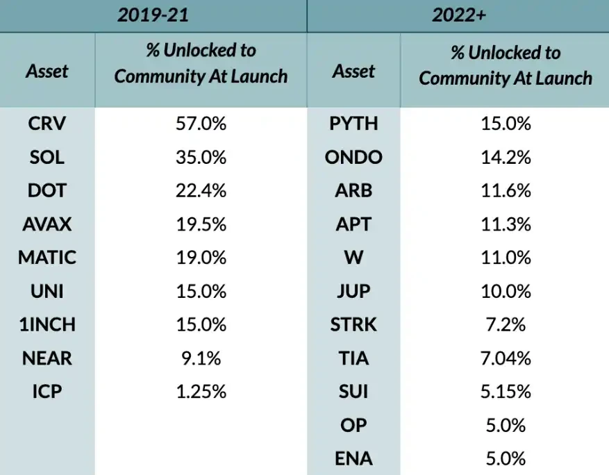 总体而言,我们看到行业标准是将代币供应量的 5-15% 左右解锁给社区,其余部分则锁定给团队、投资者、基金会、赠款或其他解锁活动。2022 年之前启动的项目往往有更多样化的分布。