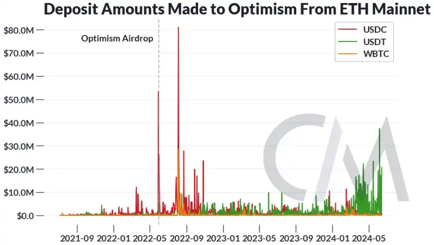 代币奖励最终只是引导网络活动的一种方式,但它们真的会带来实际使用吗?衡量实际经济活动可能很棘手,因为每个协议都有不同的用途和衡量这些用途的指标。作为一个说明性示例,我们可以以 Optimism(一个第 2 层项目)为例,将存入该网络的金额作为用户活动的粗略代理。