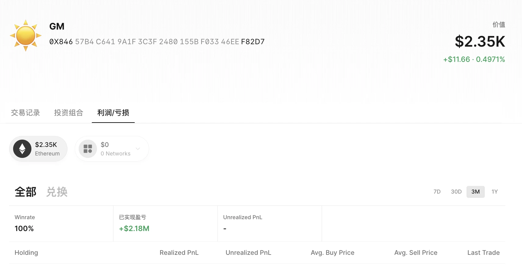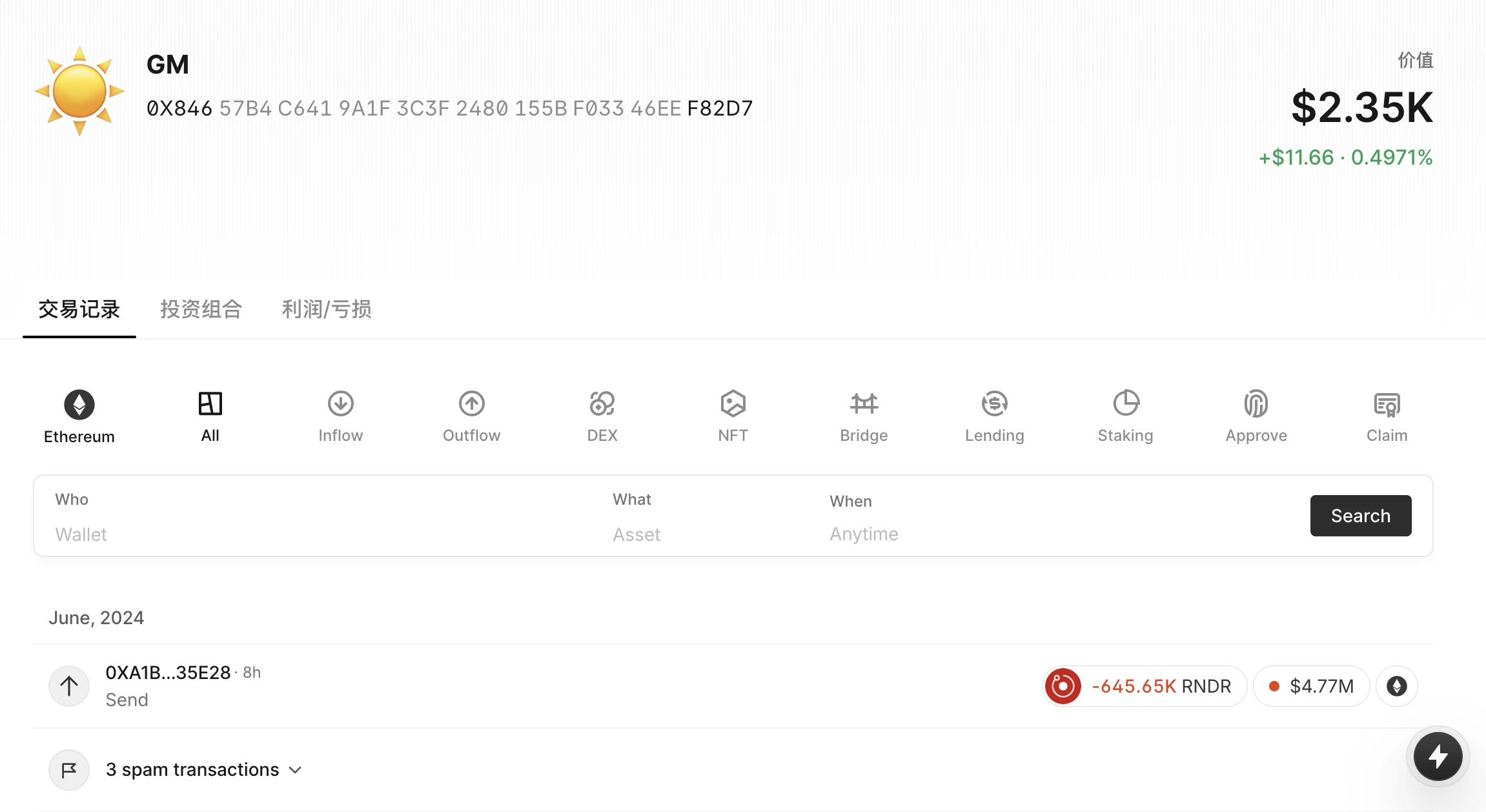 钱包余额:目前仅剩 0.666 ETH,约 2350 美元;