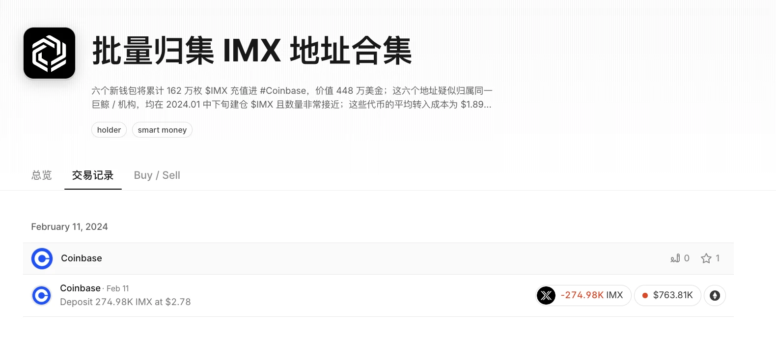 2 月 12 日,据链上分析师 Ai 姨监测,六个新钱包将累计 162 万枚 IMX 转入 Coinbase,约合 448 万美元,该批地址 疑似归属同一巨鲸/机构,均在 2024 年 1 月中下旬建仓 IMX 且数量接近;建仓成本约为 1.89 美元,全部卖出将获利 140 万美元。