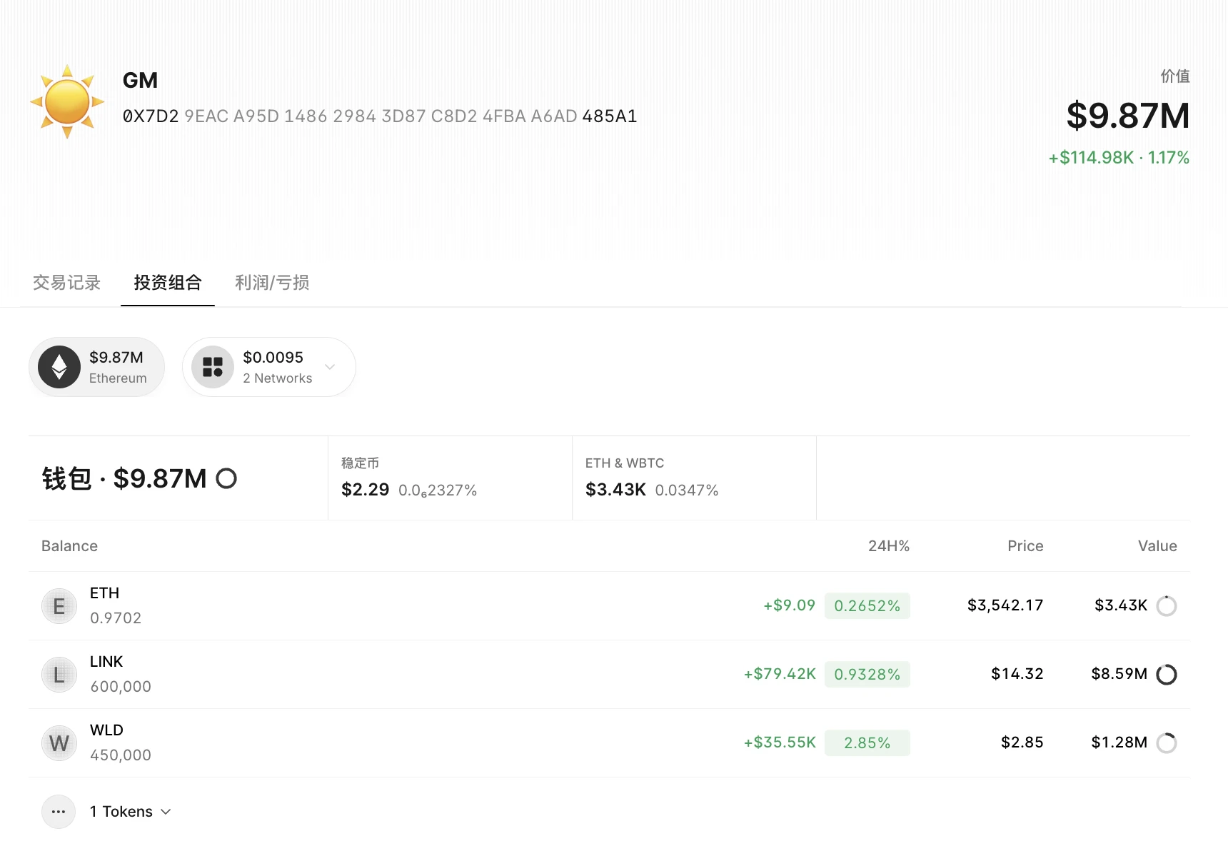 钱包余额:包括 ETH、LINK、WLD 在内,共计 987 万美元;