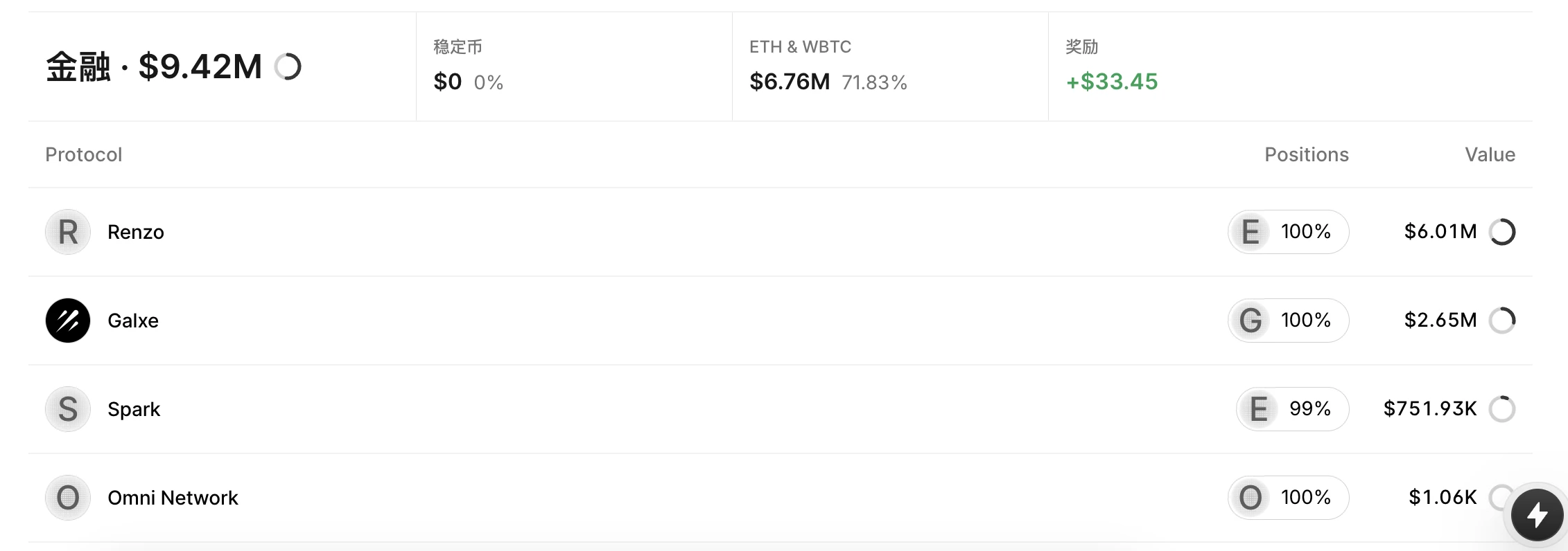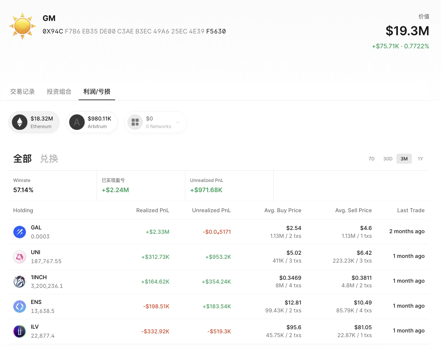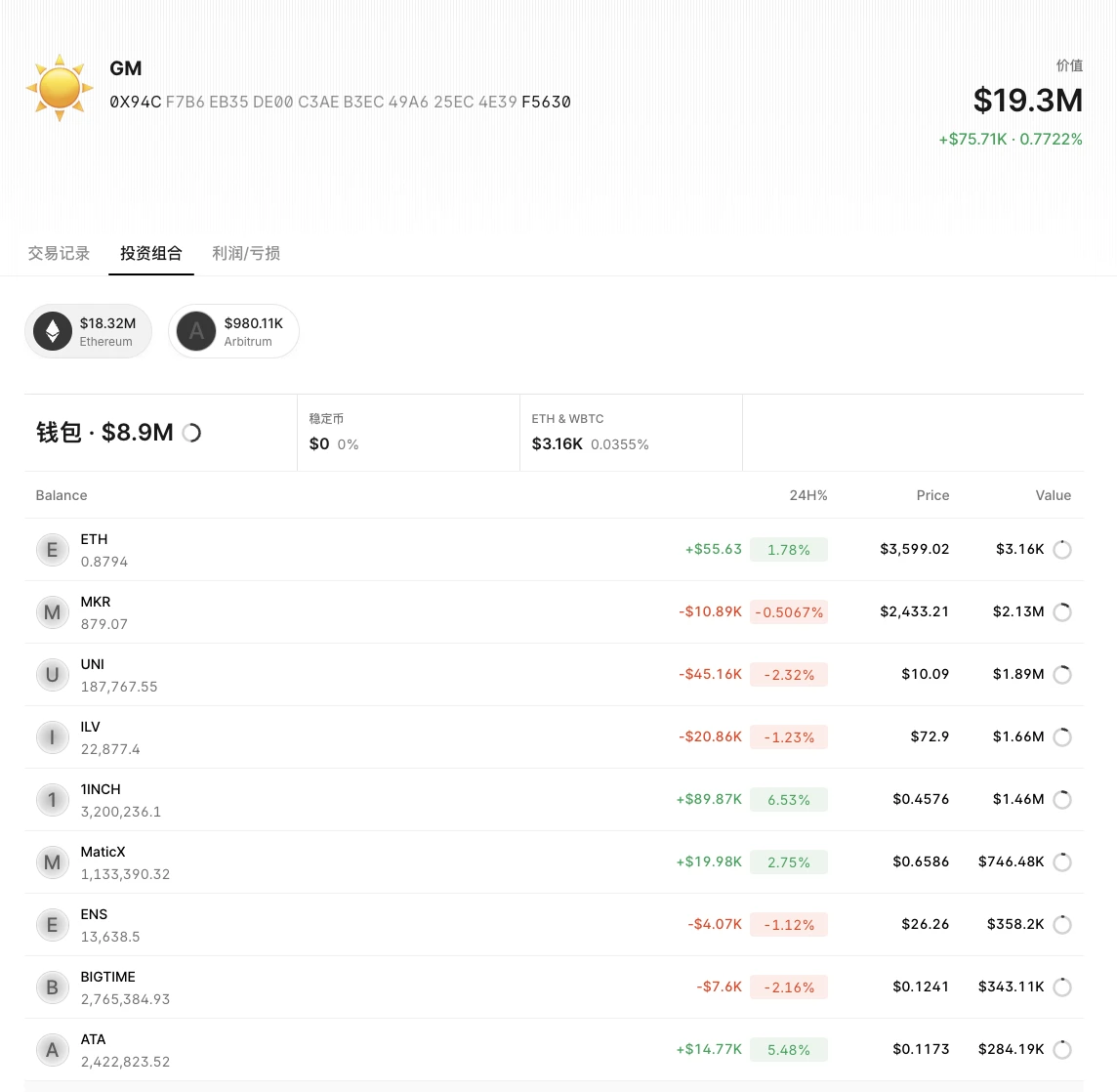 钱包余额:包括 ETH、MKR、UNI、ILV、1INCH、Matic、ENS、BIGTIME、ATA 在内的现货,价值890万美元;包括 RENZO、GLAXE、SPARK、OMNI在内的金融资产,价值942万美元,共计1930万美元;