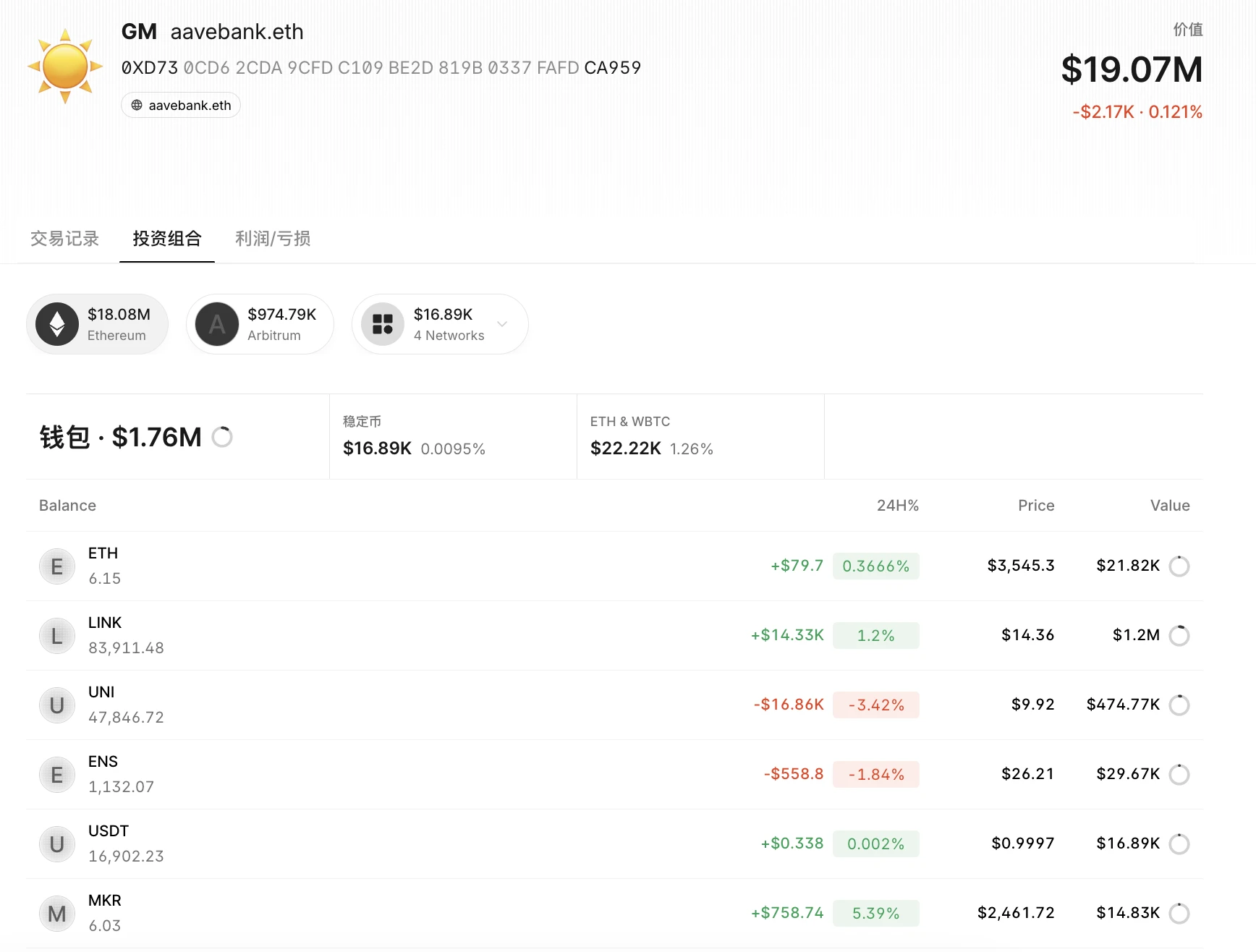 钱包余额:目前该地址仍持有不同数量的 ETH、LINK、UNI、ENS、MKR 等价值币,剩余资产价值 1907 万美元;