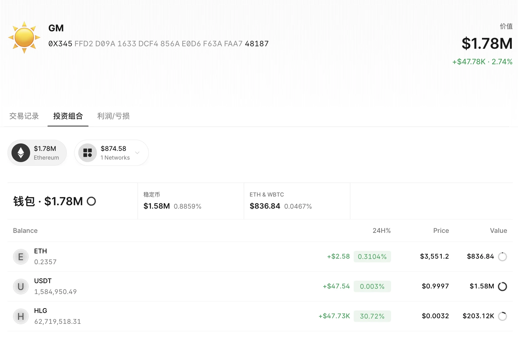 钱包余额:目前持有 158.4 万 USDT、 20.3 万美元的 HLG 及少量 ETH,总价值 178 万美元;