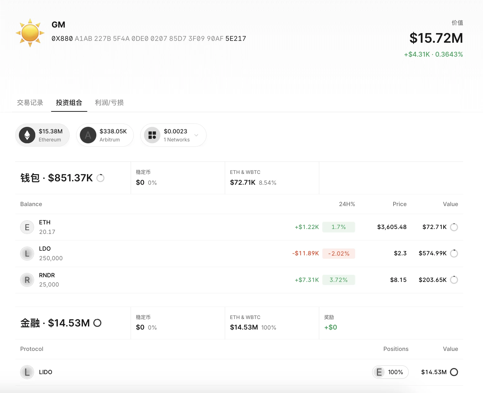 钱包余额:包括 20 枚 ETH、 25 万枚 LDO、 2.5 万枚 RNDR 现货,以及价值 1453 万美元的 LIDO,共计 1572 万美元;