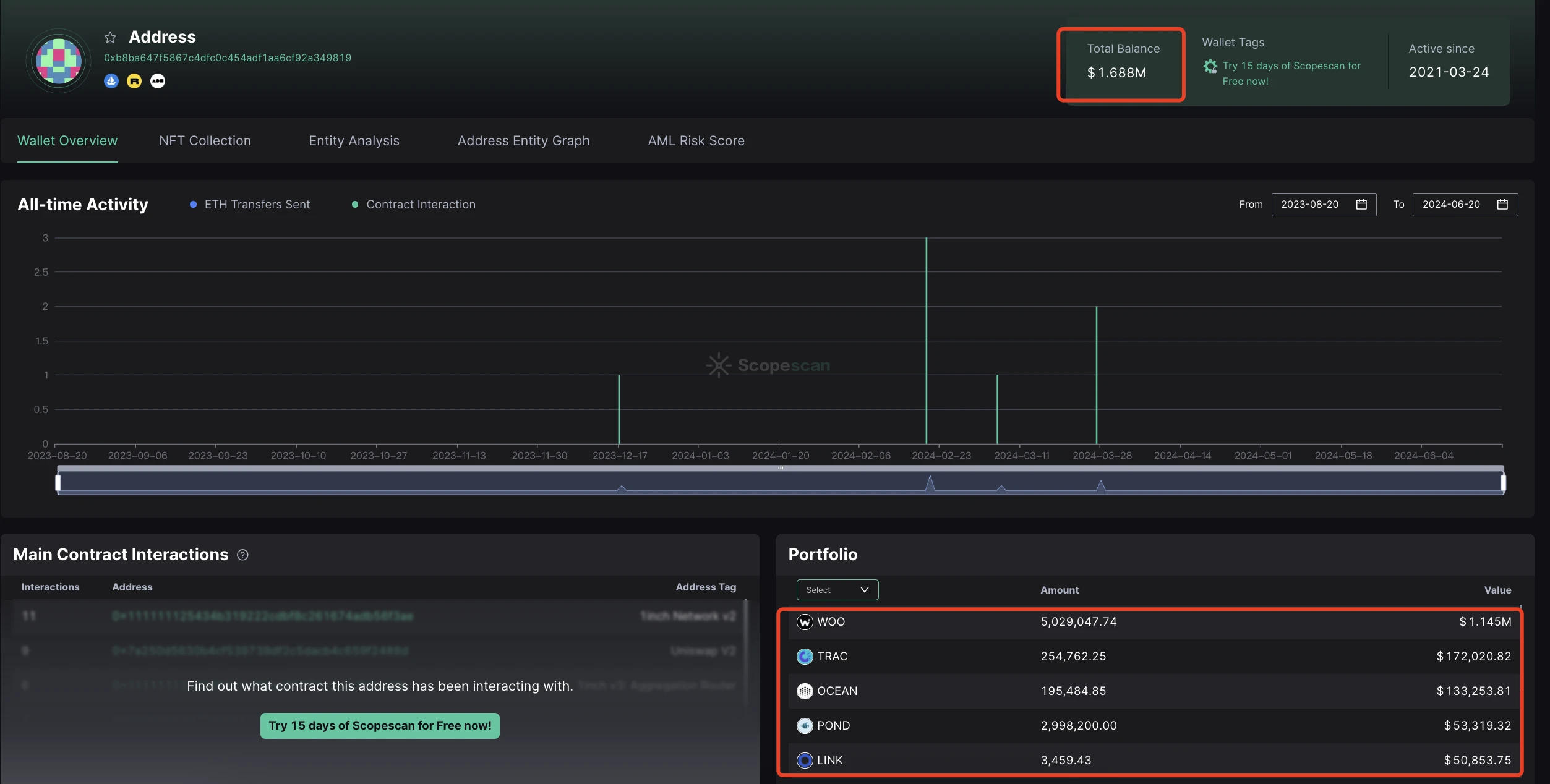 钱包余额:包括 114.5 万美元的 WOO、 17.2 万美元的 TRAC、 13.3 万美元的 OCEAN、 5.3 万美元的 POND 以及 5 万美元的 LINK,共计 168.8 万美元。