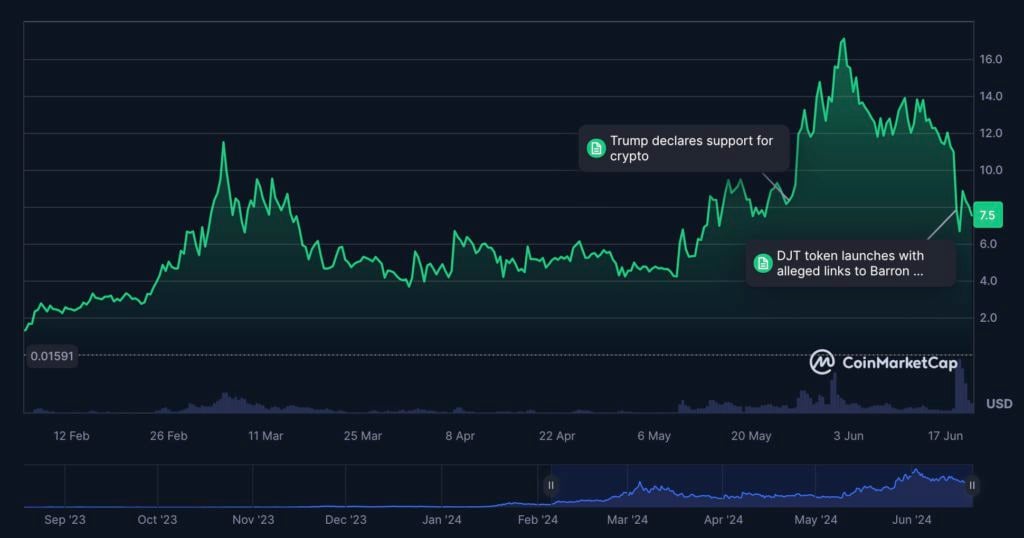 四 年一度的美国总统大选即将在今年 11 月举行,加密货币选民成为本届美国总统大选候选人积极拉拢的对象,拜登、川普最近都不断向币圈示好,令政治金融(PoliFi)迷因币掀起热潮,其中最受瞩目的是 PoliFi 龙头 TRUMP ,在 5 月一度狂飙超过 300%。