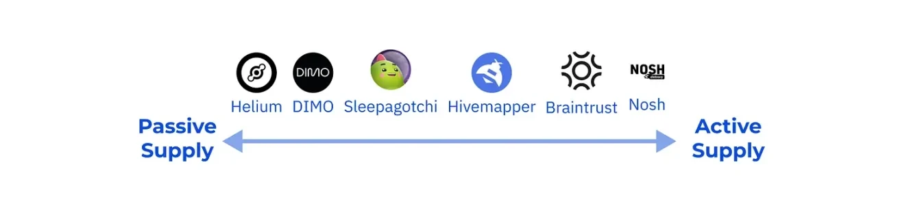 与人力劳动相对应的是资源,例如硬件、NFT 和资本。这些是被动供应的典型代表。例如,汽车数据共享网络 DIMO 要求用户购买并连接 DIMO 硬件设备。在支付一次性费用后,该设备会持续将车辆数据传输到 DIMO 网络,几乎不需要用户再次输入。