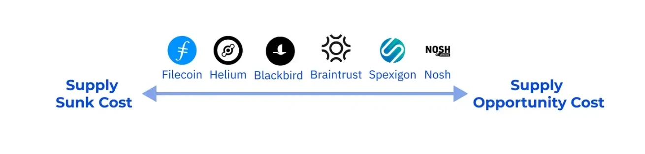最后,考虑到被动供应市场的高沉没成本,只要回报超过运营成本,供应方通常会继续为网络提供服务。当沉没成本高而机会成本低时(例如 Blackbird 餐厅接受 FLY 代币),供应方更容易留下来,因为供应方有内在的激励来为市场提供服务。相反,当高沉没成本与高机会成本同时存在时(例如 GPU 所有者为计算市场提供服务),需求或代币奖励可能是供应方选择分配资源的决定性因素。