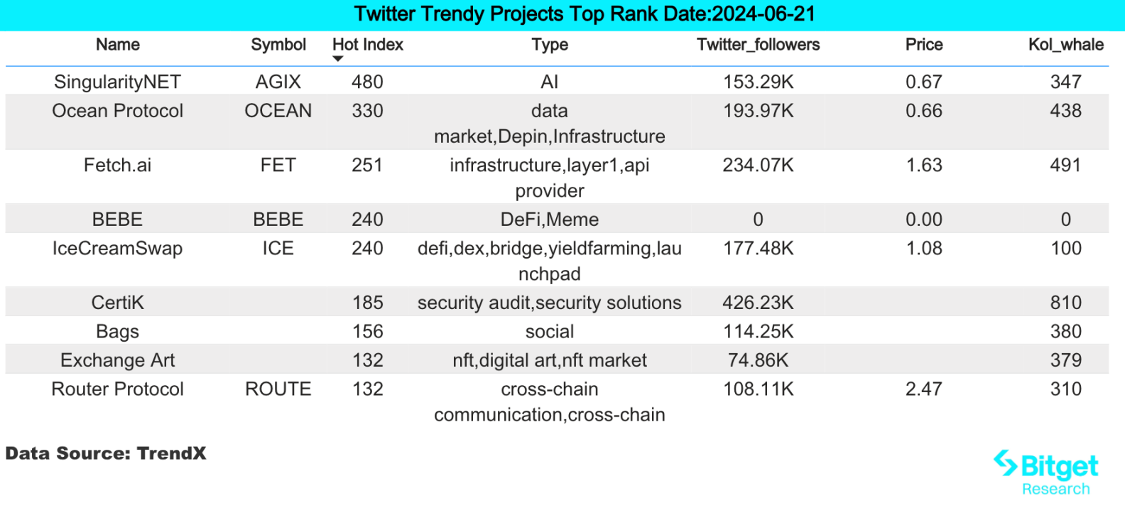 随着 NVDA 登顶全世界市值最高的公司,AI 领域的相关公司热度进一步提升;加密资产领域,Artificial Superintelligence Alliance 宣布关于 ASI 代币合并的重大进展和更新,AGIX 和 OCEAN 将于 7 月 1 日起先兑换为 FET,再过渡为 ASI 代币,刺激相关概念代币 FET、AGIX、OCEAN 价格上涨。