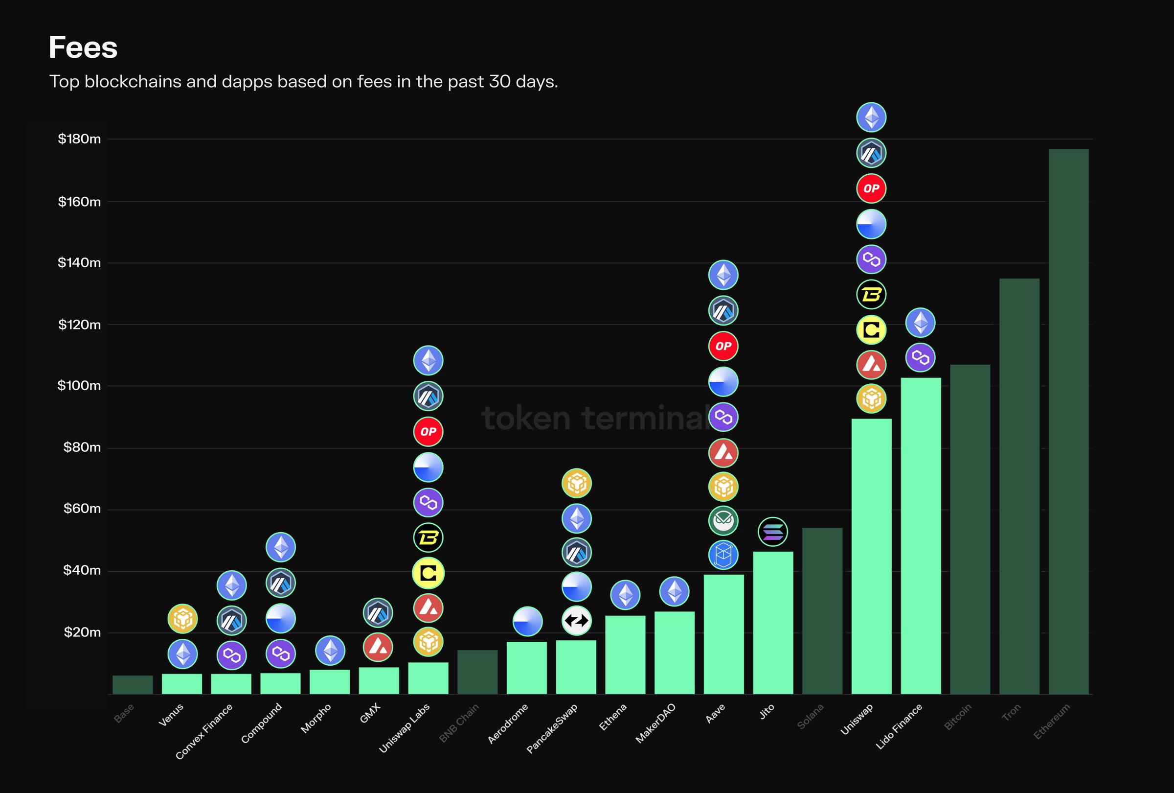 Uniswap DAO 在 DEX 类别中占据了主导地位,月费用接近 1 亿美元