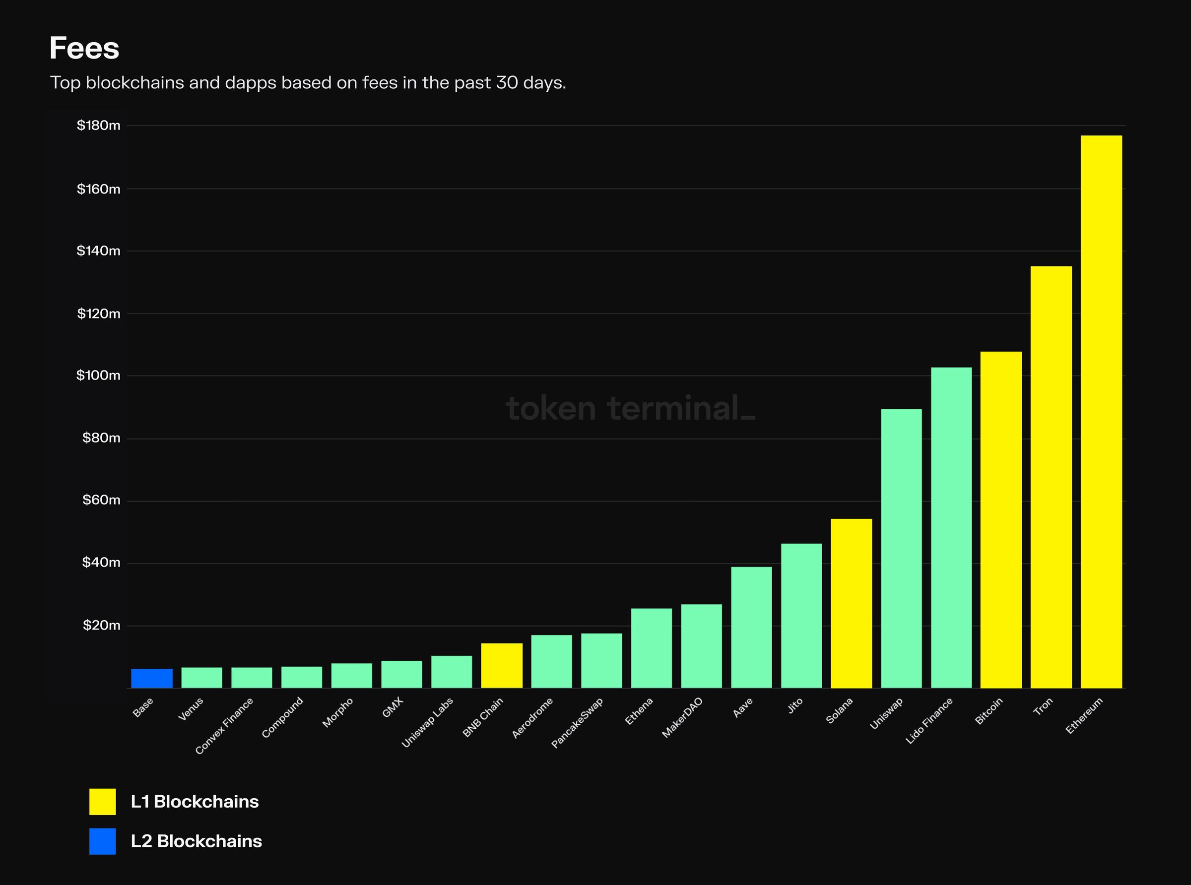 在过去 30 天里,以太坊的费用产出最高,达到约 1.8 亿美元。尽管 Base 的平均交易费用相对较低,仅约 0.03 美元(相较于以太坊 L1 的 4.5 美元),但由于 L2 层面的用户活跃度增加,Base 也成功进入了前 20 名。