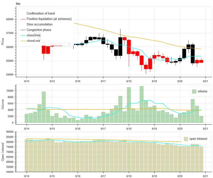 上图最上方 BTC 的价格走势,中间是成交量、最下方是未平仓量、浅蓝色是 1 天均值,橘色是 7 天均值。其中 K 线的颜色代表当前的状态,绿色是价格上升有成交量支持,红色是在平仓,黄色是在缓慢累积仓位,黑色是拥挤状态。