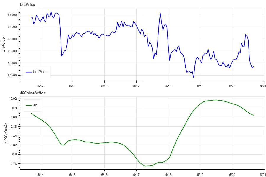 上图蓝色先为比特币价格,绿色线为['1000 floki', '1000 lunc', '1000 pepe', '1000 shib', '100 0x ec', '1inch', 'aave', 'ada', 'agix', 'algo', 'ankr', 'ant', 'ape', 'apt', 'arb', 'ar', 'astr', 'atom', 'audio', 'avax', 'axs', 'bal', 'band', 'bat', 'bch', 'bigtime', 'blur', 'bnb', 'btc', 'celo', 'cfx', 'chz', 'ckb', 'comp', 'crv', 'cvx', 'cyber', 'dash', 'doge', 'dot', 'dydx', 'egld', 'enj', 'ens', 'eos','etc', 'eth', 'fet', 'fil', 'flow', 'ftm', 'fxs', 'gala', 'gmt', 'gmx', 'grt', 'hbar', 'hot', 'icp', 'icx', 'imx', 'inj', 'iost', 'iotx', 'jasmy', 'kava', 'klay', 'ksm', 'ldo', 'link', 'loom', 'lpt', 'lqty', 'lrc', 'ltc', 'luna 2', 'magic', 'mana', 'matic', 'meme', 'mina', 'mkr', 'near', 'neo', 'ocean', 'one', 'ont', 'op', 'pendle', 'qnt', 'qtum', 'rndr', 'rose', 'rune', 'rvn', 'sand', 'sei', 'sfp', 'skl', 'snx', 'sol', 'ssv', 'stg', 'storj', 'stx', 'sui', 'sushi', 'sxp', 'theta', 'tia', 'trx', 't', 'uma', 'uni', 'vet', 'waves', 'wld', 'woo', 'xem', 'xlm', 'xmr', 'xrp', 'xtz', 'yfi', 'zec', 'zen', 'zil', 'zrx’]整体的相关性