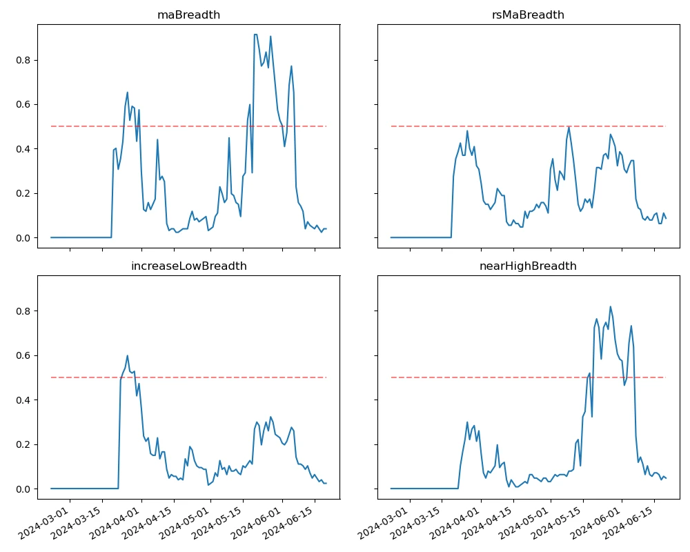 过去一周选中的 129 个币,价格在 30 日均线上方的占比为 4% ,相对 BTC 价格在 30 日均线上方占比为 8.6% ,距离过去 30 天最低价大于 20% 的占比为 2.4% ,距离过去 30 天最高价小于 10% 的占比为 4.7% ,过去一周市场宽度指标显示整体市场处于大部分币持续下跌态势。