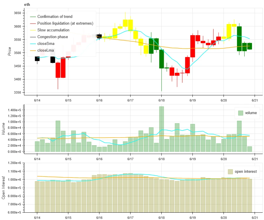 上图最上方 ETH 的价格走势,中间是成交量、最下方是未平仓量、浅蓝色是 1 天均值,橘色是 7 天均值。其中 K 线的颜色代表当前的状态,绿色是价格上升有成交量支持,红色是在平仓,黄色是在缓慢累积仓位,黑色是拥挤状态。