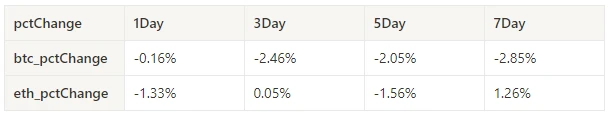 过去一周 BTC 价格下跌-2.85% ,ETH 价格上升 1.26% 。