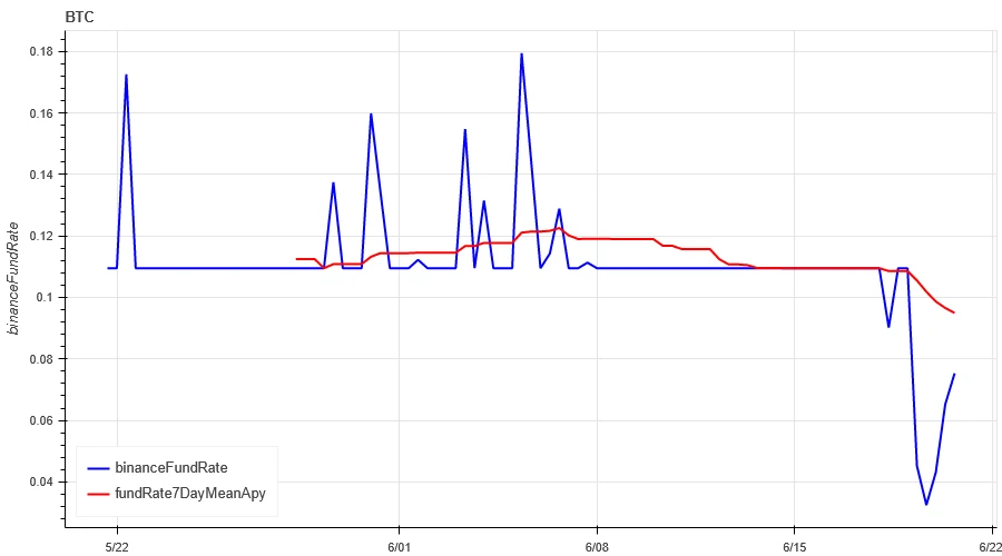 蓝色线为币安上 BTC 的资金费率,红色线为其 7 日平均