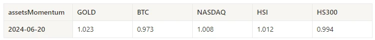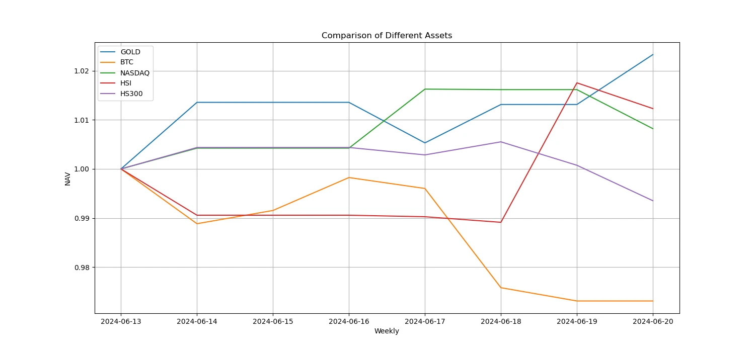 过去一周比特币/黄金/纳指/恒指/沪深 300 中,黄金最强势,而表现最差为比特币。