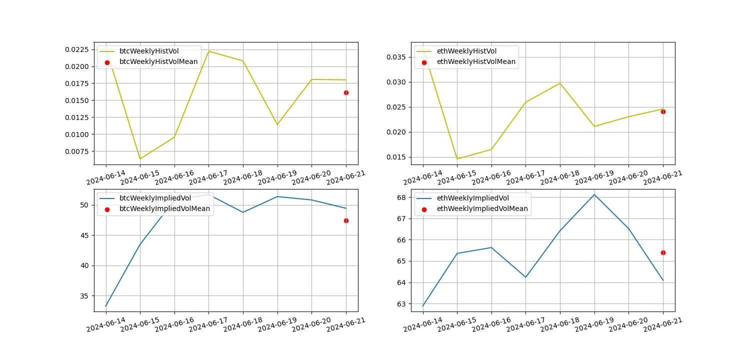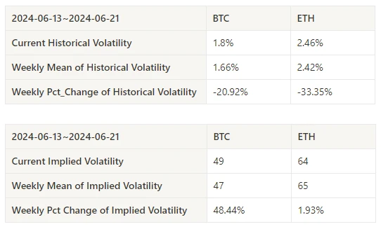 过去一周历史波动率 BTC 与 ETH 在 6.14 下跌时最高;隐含波动率 BTC 与 ETH 都较周初上升。