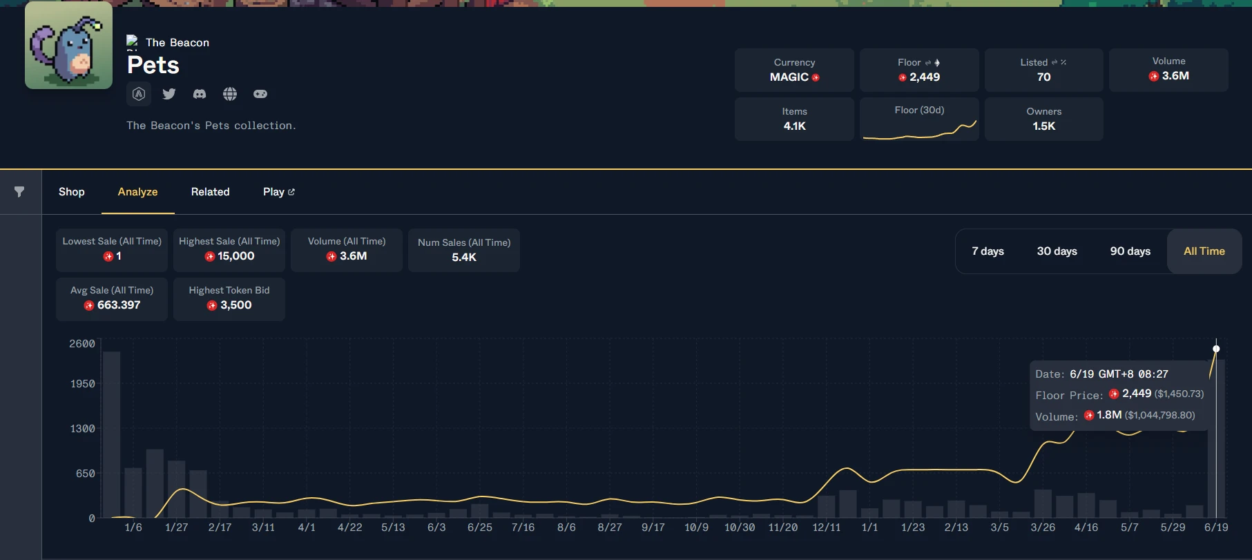 Pets NFT 第一轮发售价是 80 U,目前地板价是 2449 U,涨了 2061% 。