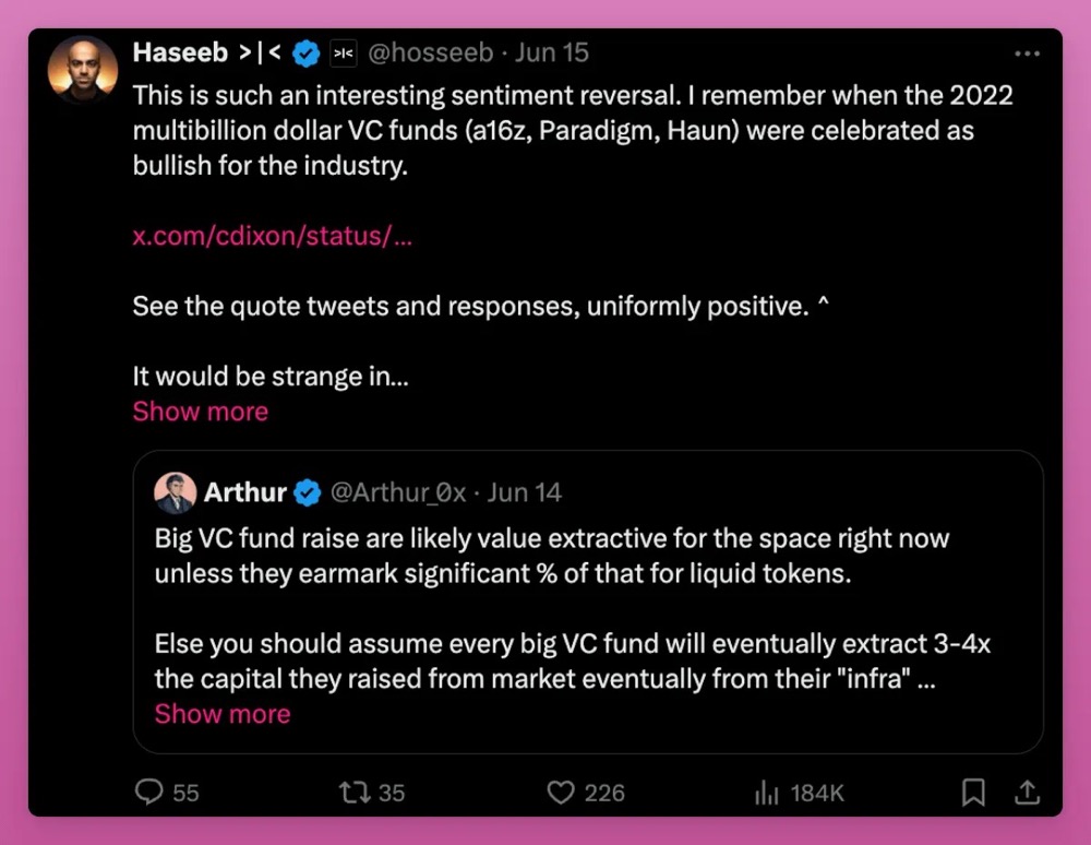 对于低流通高 FDV 的代币发行机制,风险投资公司也难辞其咎。风险投资曾被视为积极信号,但加密货币社区现在却将其视为一种价值榨取。人们担心的是,风险投资公司的目的是通过出售他们以最低成本获得的大量代币分配来获利。