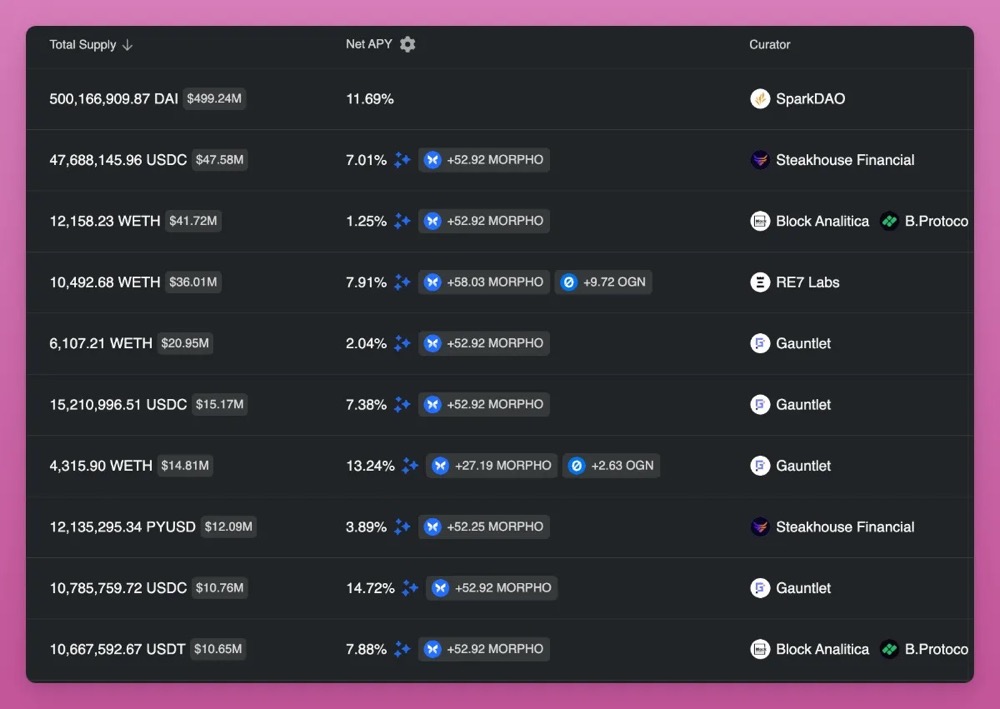更重要的是,DeFi 协议也在进行调整,允许 DeFi 中的「麦肯锡」管理用户资产并将风险管理外部化。比如, Morpho Blue 的无许可借贷允许 DeFi 中的「麦肯锡」创建具有任何资产和风险参数的市场,而无需依赖治理。其中,最受欢迎的财库由 Gauntlet、Steakhouse、RE7 Labs 等管理。