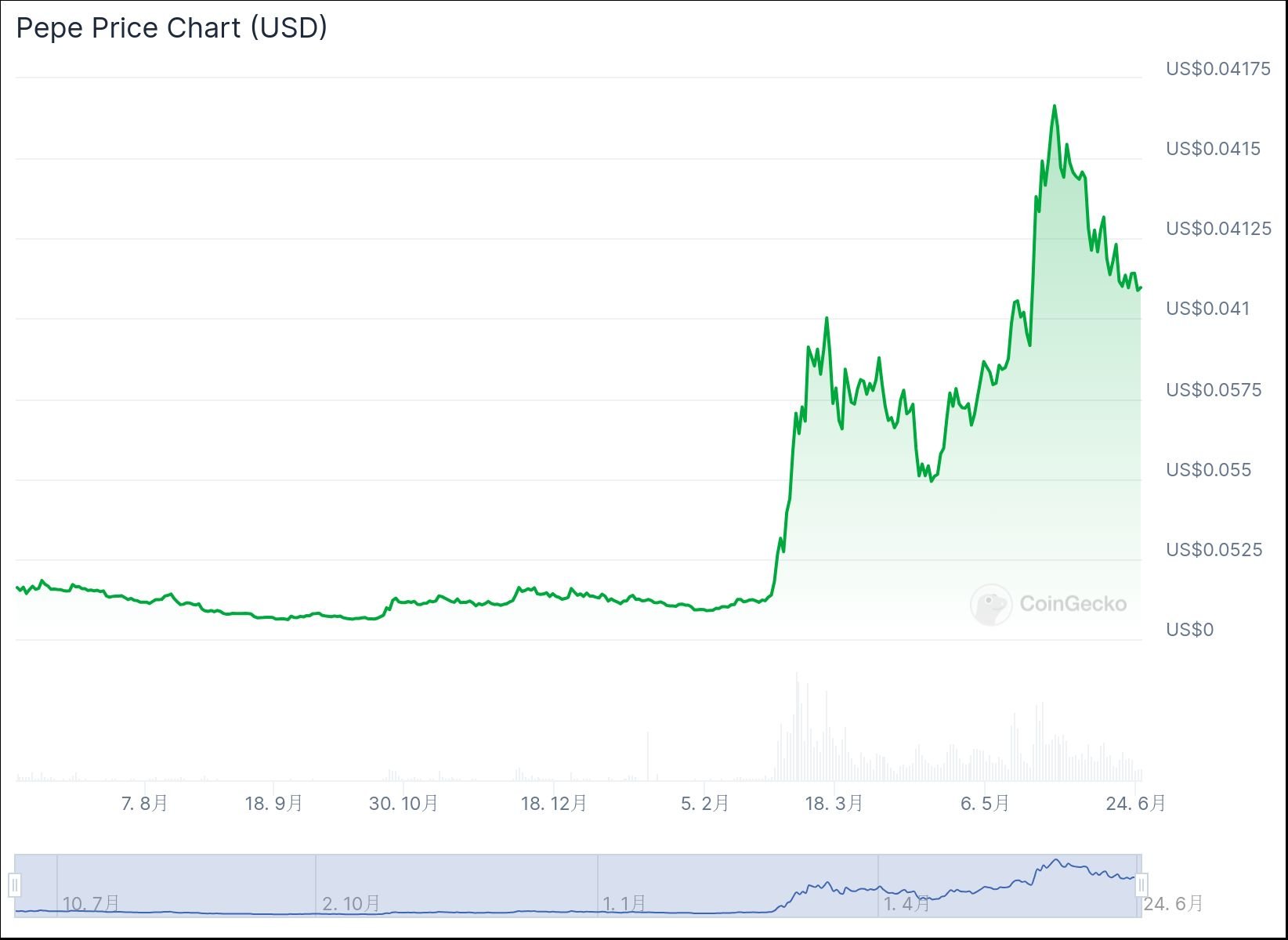 Pepe 在 5 月 27 日 达到 0.00001717 美元的历史高点,随后𫔭始走跌,过去一个月已回落 22.7%,现报 0.00001097 美元,但 PEPE 从 0.000010 美元触底反弹,表明多头正尝试上攻。