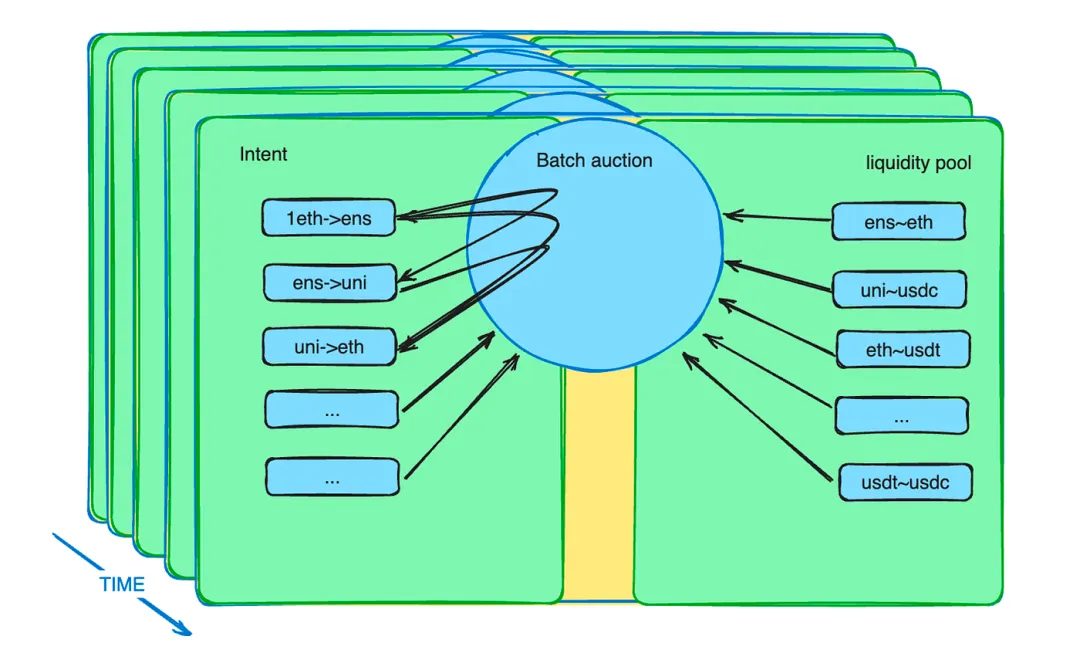 除了上一节提到的 MEV 重新分配,批量拍卖能做的事情还远不止这些。交易者发送给智能合约的不是指令,而是一个意图。这个意图可以持续几分钟。这些意图打包成一个批次,并向一组相互竞争的特定交易代理提出建议。我们知道,意图海量,流动性池各式各样,优化是一个难题。专业的事情交给专业的人去做,这样可以提高系统效率。