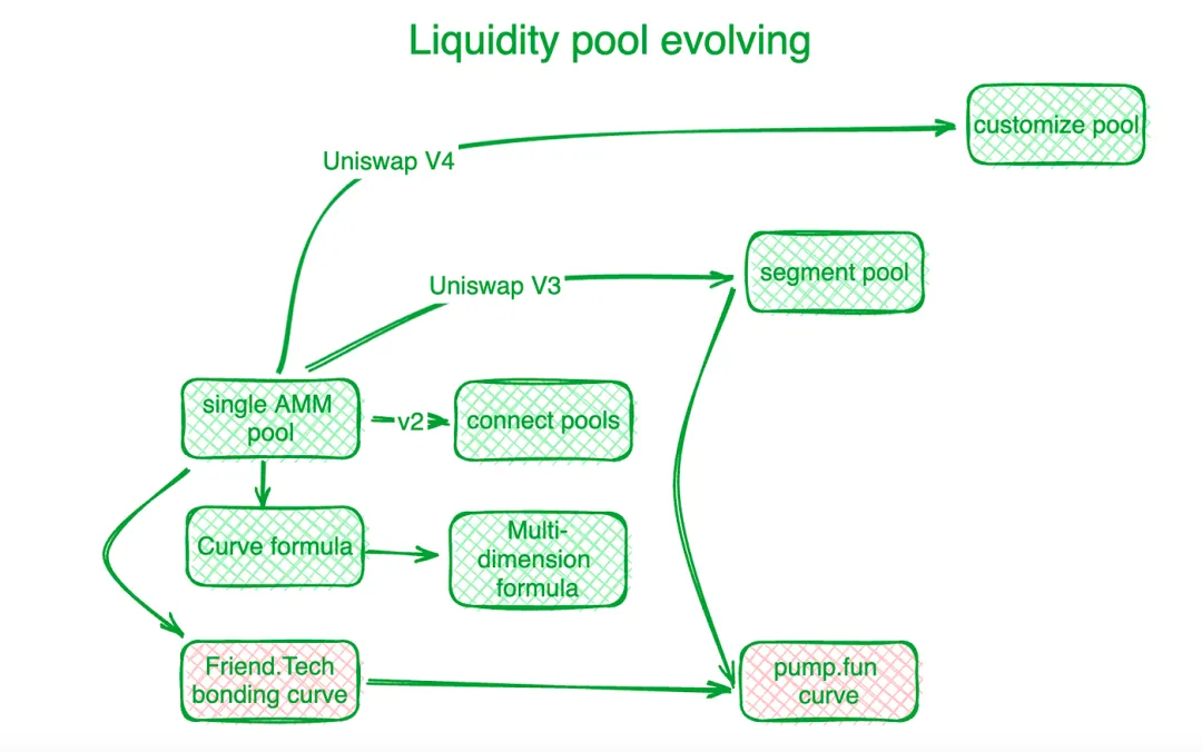 去中心化交易所通过创新去解决这一三难困境和其他链上交易挑战方面早已取得了重大进展。万里长征起于足下,第一步就是建立链上流动性。在这里做一个简单的行业梳理:Uniswap 是这个细分行业的标杆。联合曲线的创新标志着一个新时代的开始。在 Uniswap 的“X*Y=C”曲线之前,去中心化交易所使用订单簿来结算链上交易需求。随后的自动做市商 (AMM) 遵循 Uniswap 的探索方向,创建了流动性池。在 Uniswap V2 中,不同交易对池中的流动性通过算法连接起来。Uniswap V3 引入了分段流动性池,允许用户定义他们想要提供流动性的价格区域。Uniswap V4 通过提供流动性池定制解决方案进一步推进了这一点。