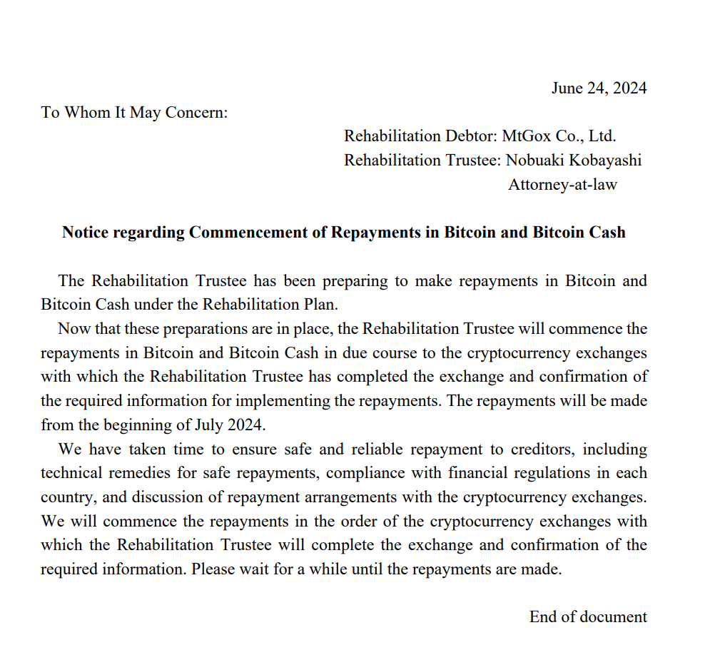 据稍早披露的官方网站文件显示,Mt.Gox 受托人表示将从 7 月初开始启动 BTC 和 BCH 偿还工作。当前,这些准备工作已经准备就绪,并与相关交易所完成了偿还所需信息的交换和确认。