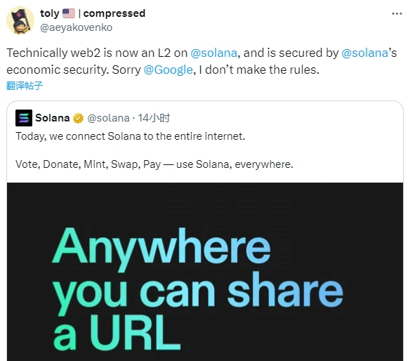 但 Solana 并非仅将这一特性视为“功能改进”,而是一种“ 范式创新 ”。Solana 联创 toly 表示,通过 Blinks, Web2将成为 Solana 的L2 ,并获得后者的经济安全性。诚然, X 平台作为社交应用具有最强的传播能力,而将通向Web3的链路最小化有助于促进用户的转化率,将“活跃=访问×转换”的等式放大到最大 。