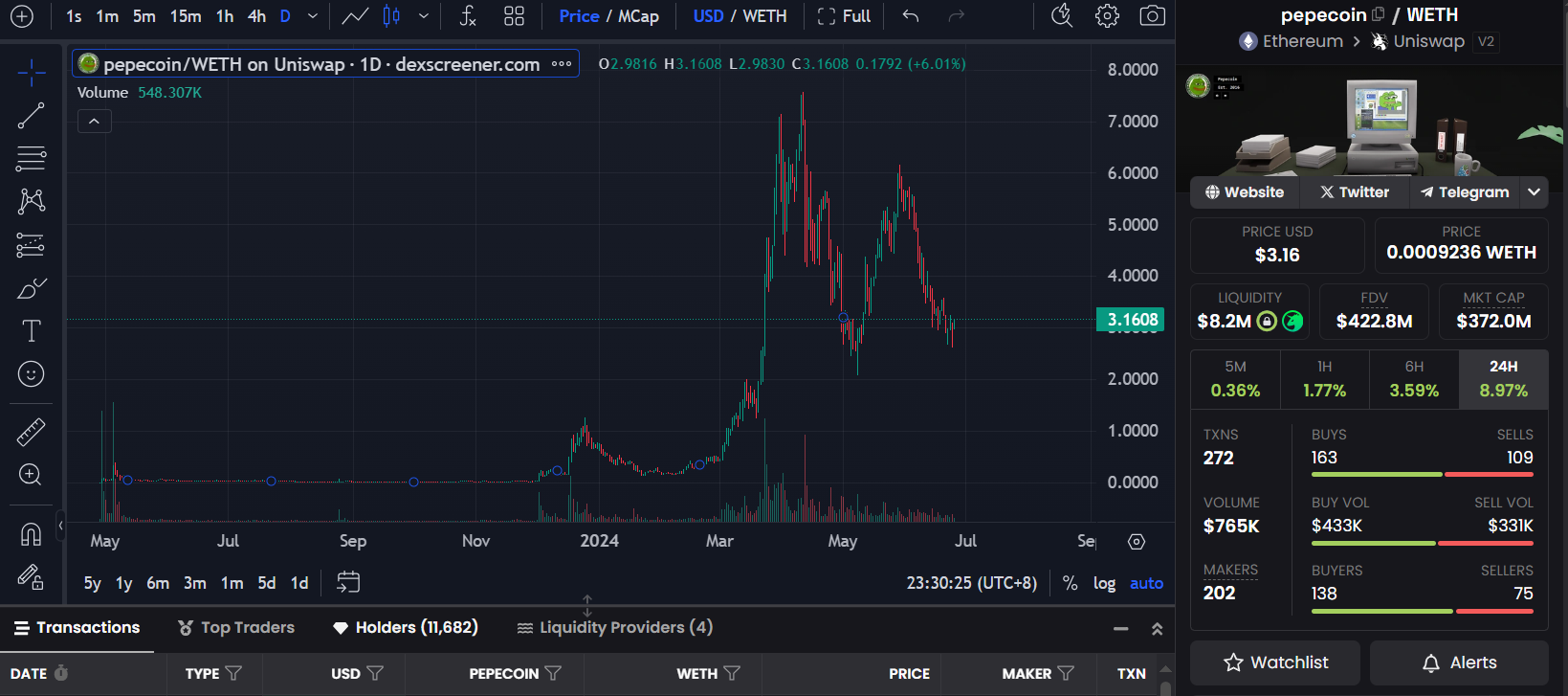 据小编调查,$Pepecoin 的池子比较大,在年初 $Pepe 疯涨的时候 $Pepecoin 也跟着狂涨一波,到现在仍未归零(但是已经腰斩)。