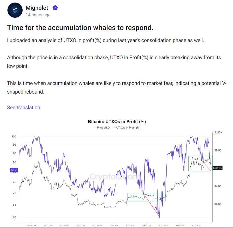 CryptoQuant 分析师 Mignolet 表示 ,根据去年比特币在盘整阶段的 UTXO 盈利率百分比来看,虽然比特币目前处于盘整阶段,但 UTXO 盈利率百分比明显已经脱离了低点。因此,比特币巨鲸可能会对市场的恐慌情绪做出反应,这也预示著市场或许将出现 V 型反弹。