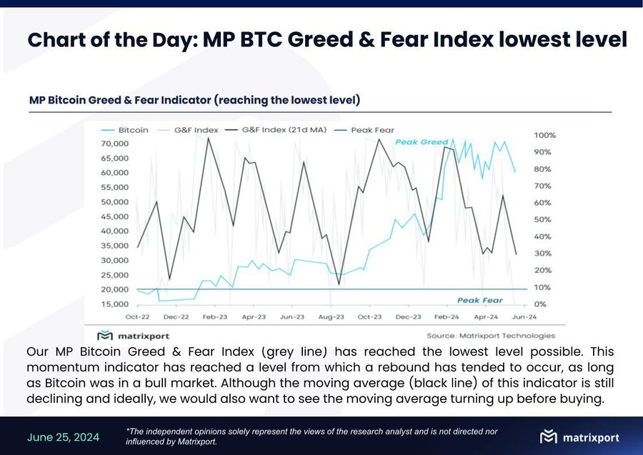 Matrixport 也在昨日 指出 ,比特币的贪婪与恐惧指数可能已经达到最低水平,这也预示著市场可能将触底反弹: