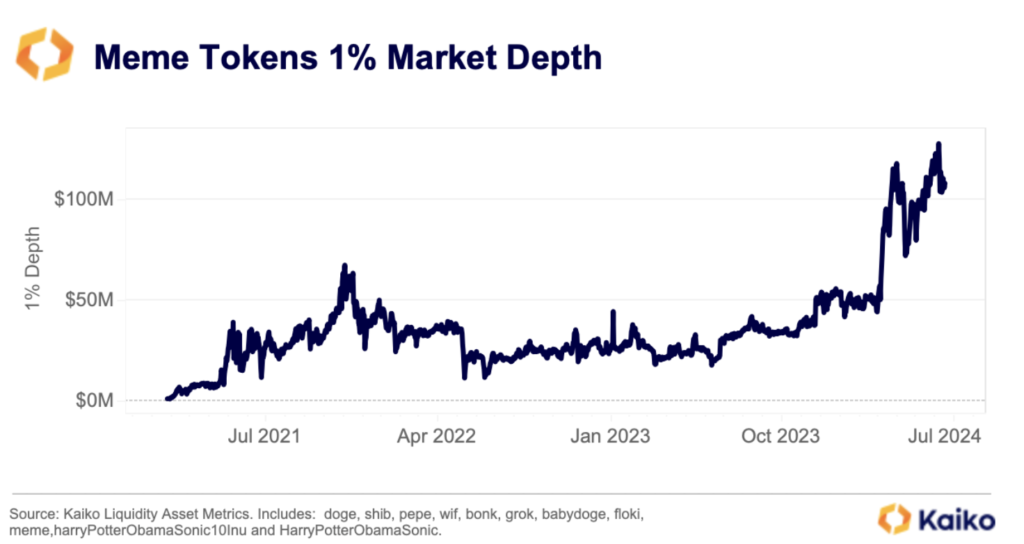 侭管主导地位有所下降,但值得注意的是, Memes 的流动性目前处于顶峰 。根据 Kaiko 的资料,DOGE、SHIB、PEPE、WIF、BONK、GROK、BABYDOGE、FLOKI、MEME、HarryPotterObamaSonic10Inu 和 HarryPotterObamaSonic 的 1% 市场深度最近创造了 1.28 亿美元的历史新高。