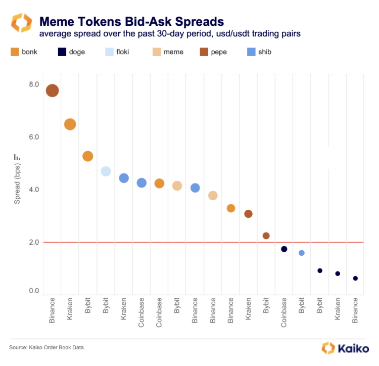 根据经验,流动性越高,市场越健康,因为可以执行大额交易而不必担心价格受到影响。回顾过去,这收紧了𧹒卖价差。然而,Memes 的交易成本仍然很高。在大多数交易所,𧹒卖价差超过 2 个基点,这支援了上述叙述。