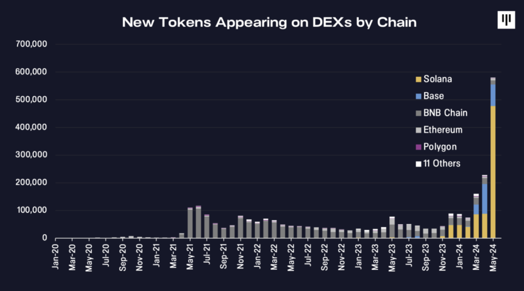 Pantera Capital 最近的报告指出:「到 2024 年 5 月,Solana 占所有出现在 DEX 上的新代币的 85%,高于一年前的 50%。基于 Solana 的代币增长,反应了其在 memecoin 活动的推动下在散户使用方面的优势。」