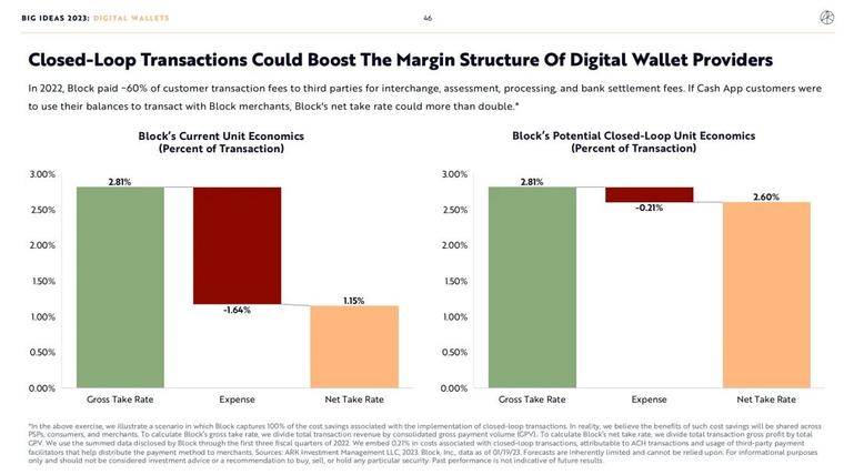 2022 年,Block 向第三方支付了约 60% 的客户交易费用,用于交换、评估、处理和银行结算费用。如果 Block 面向前端消费者的应用 Cash App 能够让用户使用他们的余额与 Block 商家进行交易,Block 的净收费率可能会增加一倍以上。