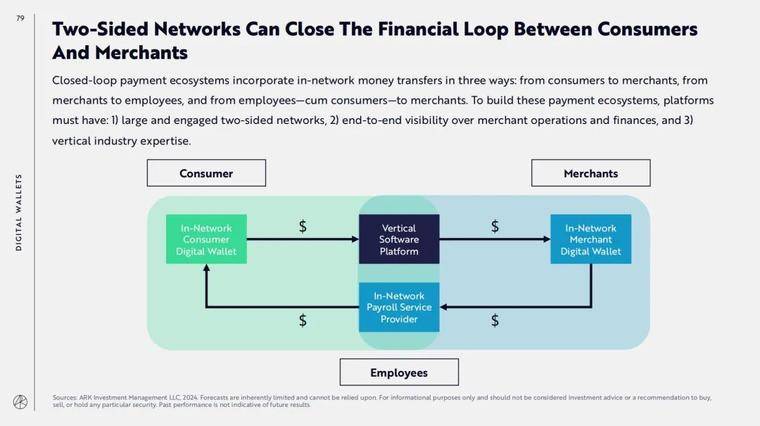 此外,在 2024 的报告中,ARK 又专门在闭环支付生态中加入了对于商家的金融服务和商家员工的工资 / 支付等业务。